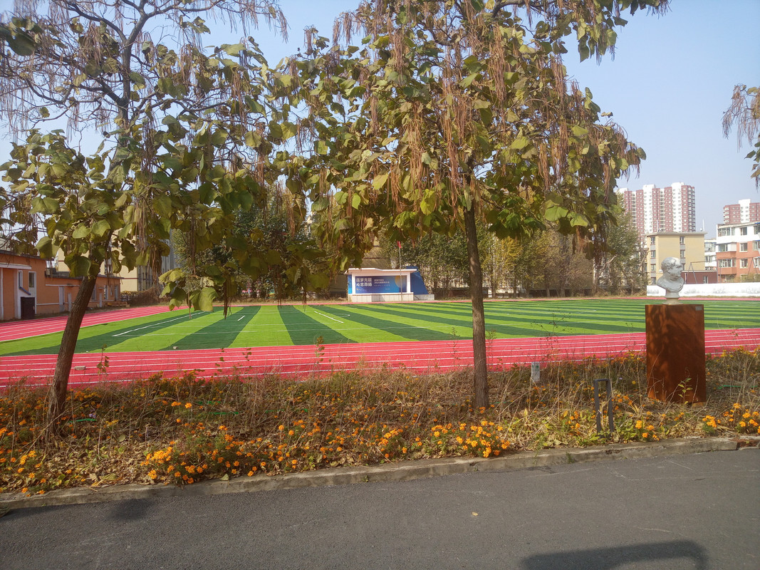 不是特别大,跑道是方形的假草那种材料做的。
